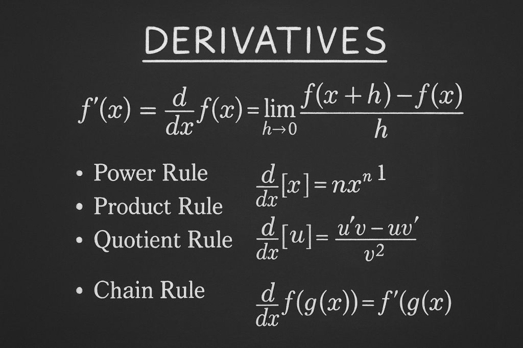 After warming up with simple rules, like the power rule (d/dx[xn]=nxn−1d/dx[x^n] = nx^{n-1}d/dx[xn]=nxn−1) and basic derivatives of constants and linear terms, we got into more detailed rules — the product rule, quotient rule, and chain rule. These rules make it possible to handle complex composite functions, where terms are multiplied or nested inside each other. It was actually satisfying to see how all these separate pieces fit together logically.